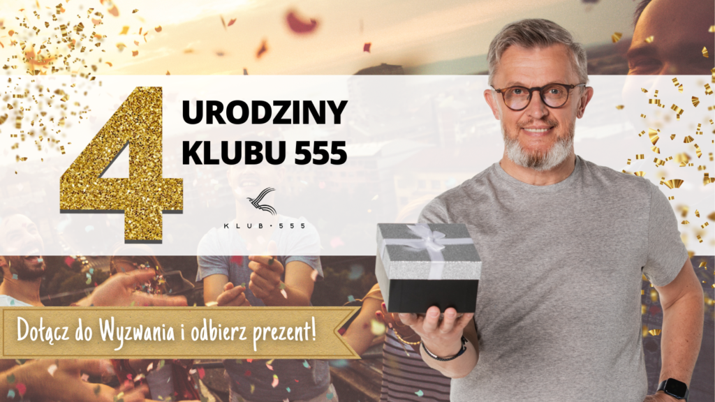 Przygotowałem 31-dniowe Wyzwanie Klubu 555, podczas którego będę wspierać Cię, motywować i wspólnie z Tobą budować nowe nawyki. To gra, w której Waszym zadaniem będzie codzienne uczestnictwo w porannych spotkaniach Klubu 555. W zamian za swoją systematyczność, wytrwałość i odznaczanie obecności na Klubie będziecie zdobywać wyjątkowe rozwojowe materiały